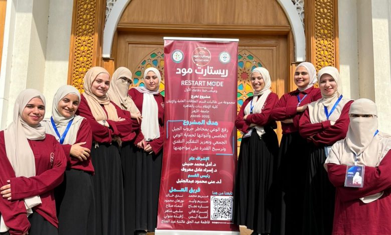 أطلقت مجموعة من طالبات قسم العلاقات العامة والإعلان بكلية الإعلام بنات جامعة الأزهر، مشروع تخرجهن تحت عنوان «ريستارت مود»، والذي يهدف إلى رفع الوعي بمخاطر حروب الجيل الخامس وأدواتها، بما يسهم في حماية الوعي الجمعي وتعزيز التفكير النقدي لدى الشباب.
