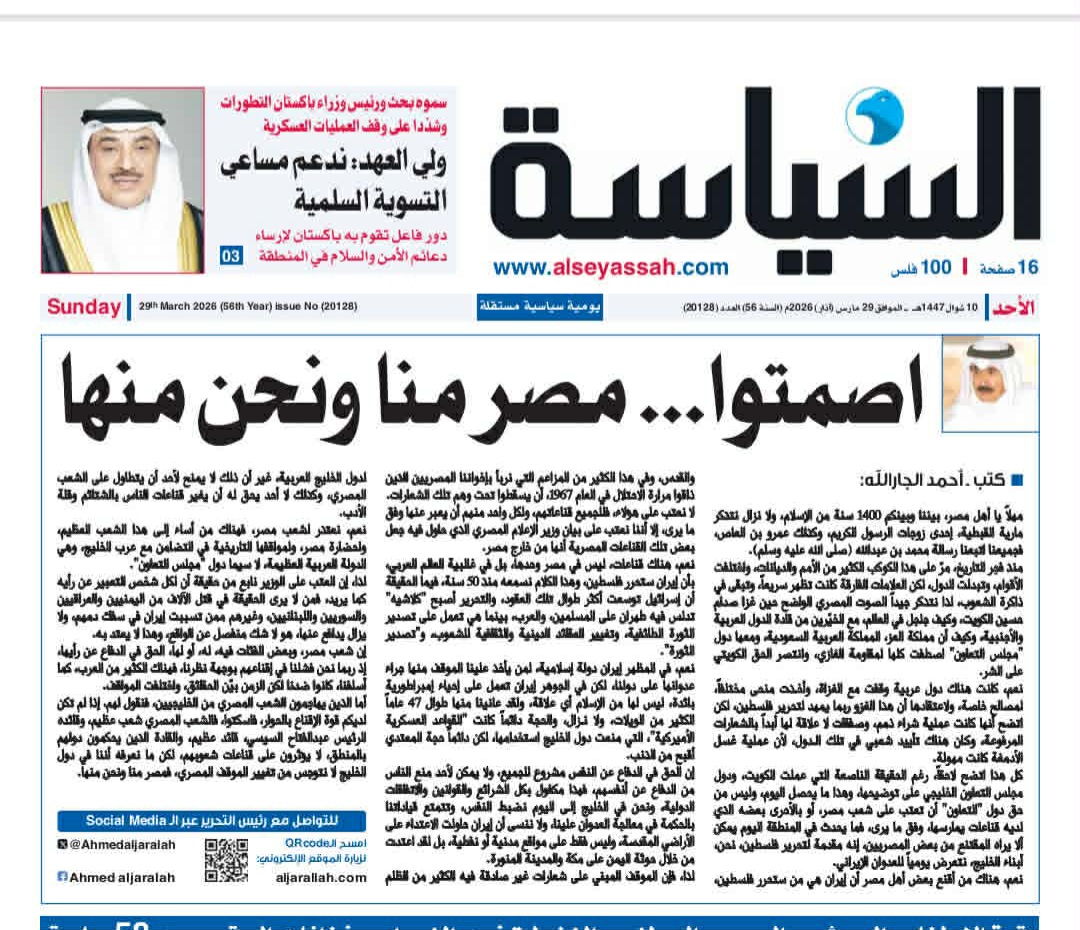 وفي مقال بعنوان «اصمتوا.. مصر منا ونحن منها»، نشرته جريدة «السياسة» في عددها الصادر الأحد 29 مارس 2026، أكد الجارالله، أن العلاقة بين مصر والعرب ليست تحالفًا سياسيًا عابرًا، بل رباط دم وعقيدة يمتد لأكثر من 1400 عام، مستشهدًا بمكانة السيدة مارية القبطية لدى الرسول ﷺ، موجهًا رسالة لوم شديدة لكل من يتجرأ على الإساءة إلى الشعب المصري أو قيادته.