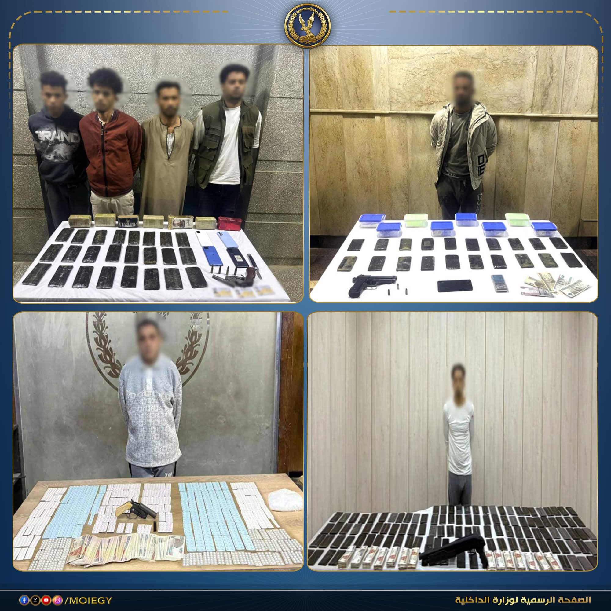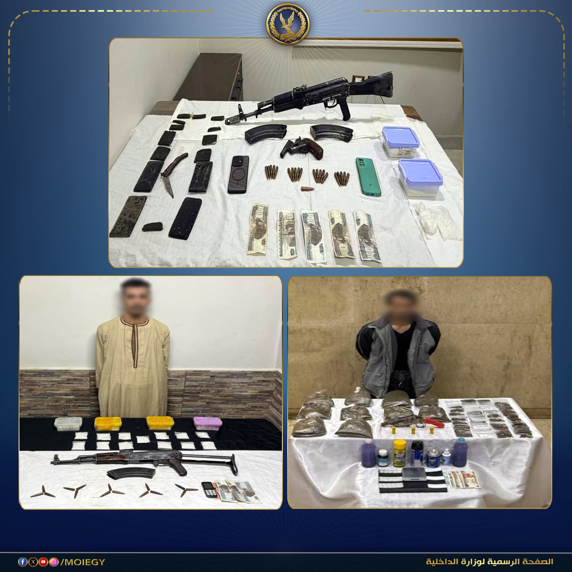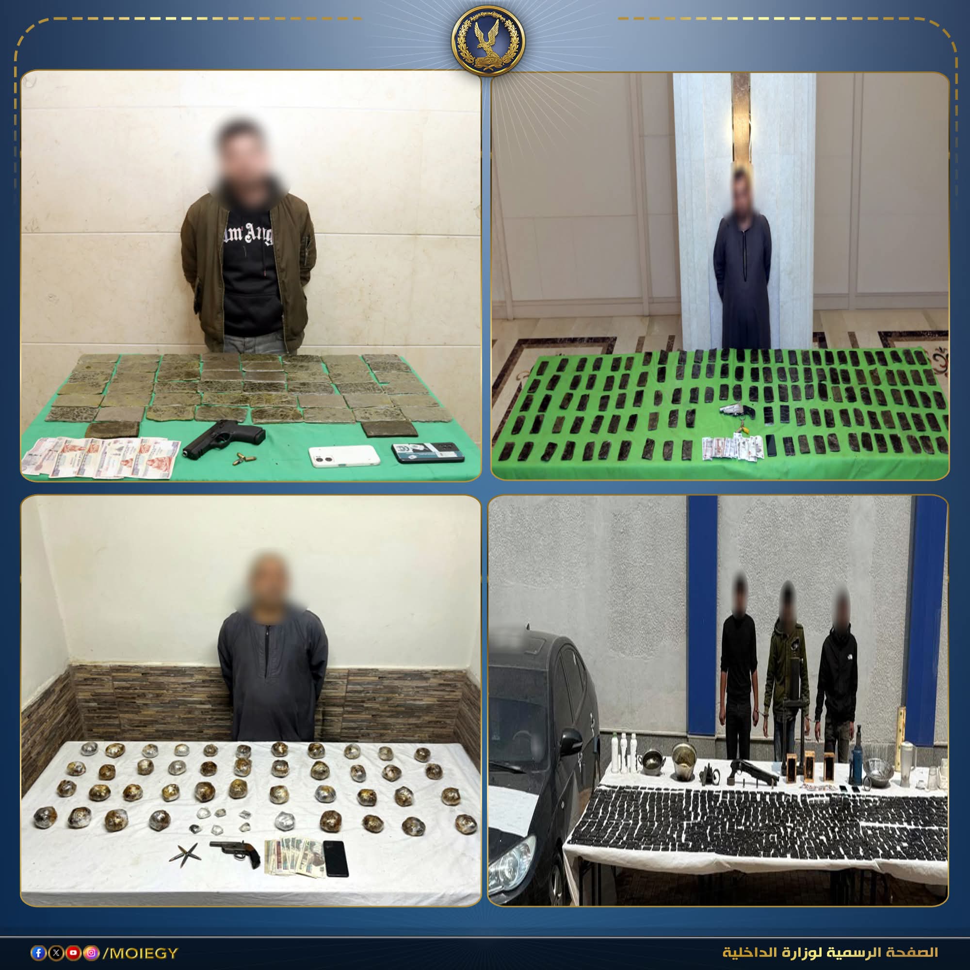 في إطار مواصلة وزارة الداخلية توجيه الضربات الاستباقية للبؤر الإجرامية من جالبي ومتجري المواد المخدرة وحائزي الأسلحة النارية غير المرخصة، أكدت معلومات وتحريات قطاعي الأمن العام ومكافحة المخدرات والأسلحة والذخائر غير المرخصة، بالتنسيق مع مديرية أمن القاهرة وأجهزة الوزارة المعنية، قيام بؤر إجرامية بنطاق عدد من المحافظات، تضم عناصر جنائية شديدة الخطورة، بجلب كميات من المواد المخدرة تمهيدًا للاتجار بها، وحيازة أسلحة نارية غير مرخصة.