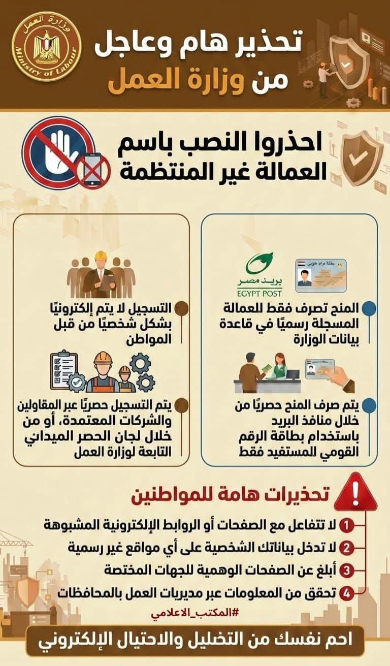 وناشدت الوزارة المواطنين ضرورة توخي الحذر وعدم الانسياق وراء هذه المحاولات الاحتيالية، وعدم التعامل مع الصفحات أو الروابط الإلكترونية المشبوهة، أو إدخال البيانات الشخصية عبر مواقع غير رسمية، مع سرعة الإبلاغ عن أي صفحات أو جهات وهمية للجهات المختصة، والتأكد من صحة المعلومات من خلال مديريات العمل بالمحافظات.